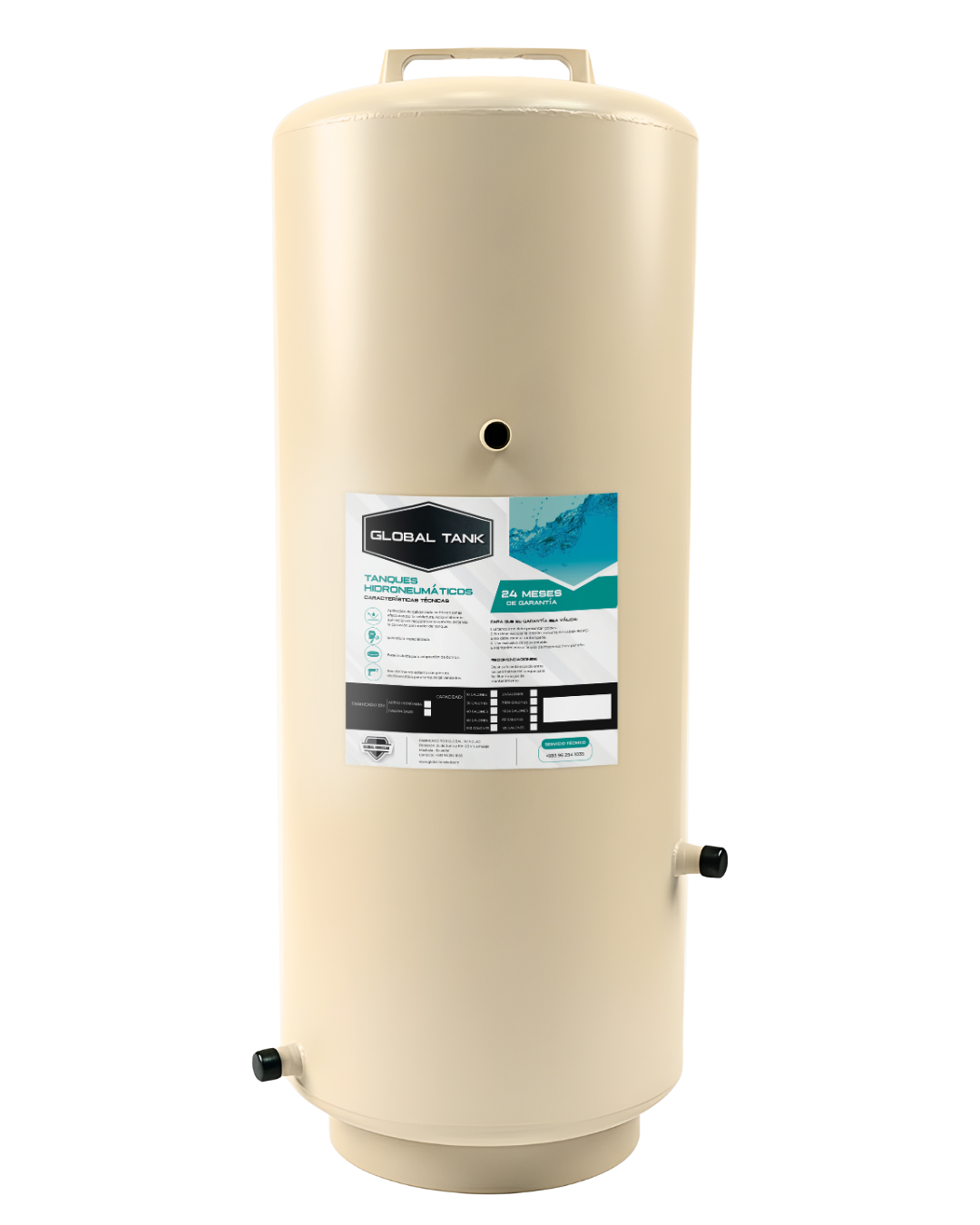 Tanque hidroneumático vertical de 80 galones, fabricado en acero galvanizado con recubrimiento interior epóxico grado alimenticio y soldadura de alta resistencia.